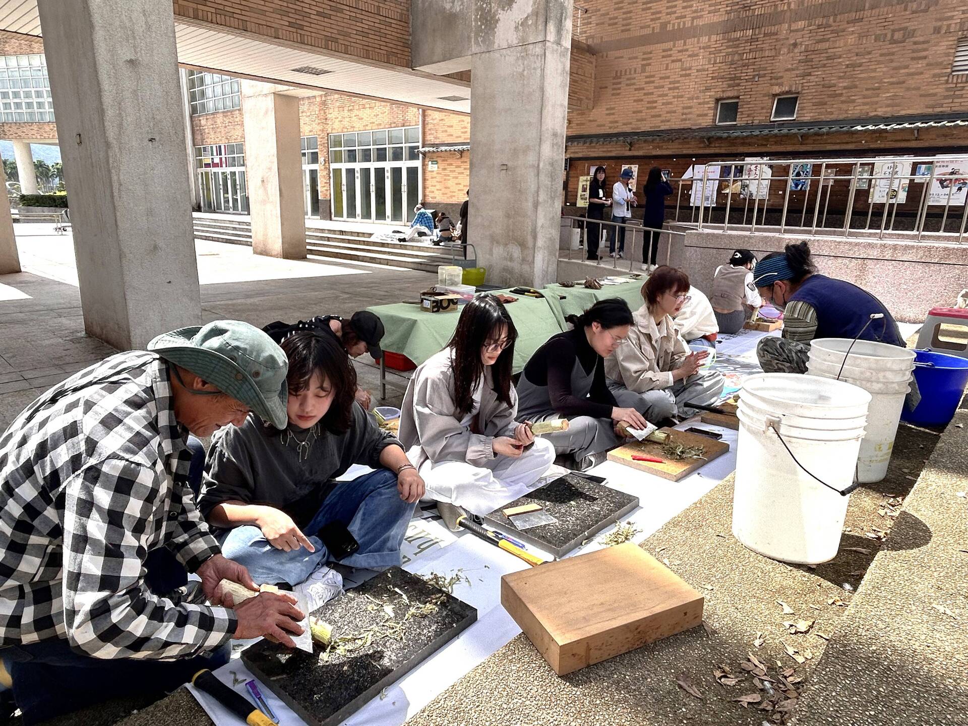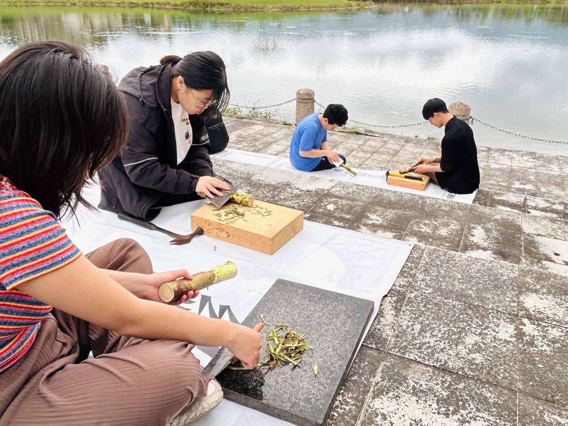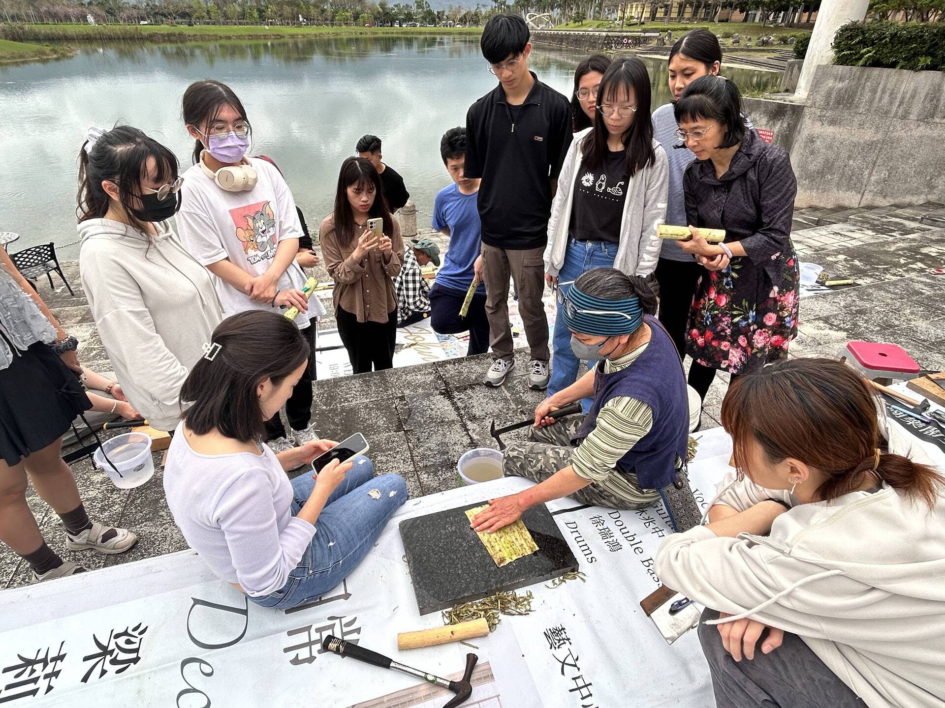 纖維藝術家淑燕老師長期投入樹皮布的創作研究與教學,她分享植物纖維與人的內在情感有著深刻的共鳴,能夠引導我們更直接地認識環境,也喚醒內在的感受力。從採集開始,老師帶領學員前往湖畔,親身認識構樹群,學習辨識與觀察。隨後,在刨除表皮、取下纖維、搥打洗滌的過程中,透過鎚起鎚落的節奏,構樹逐漸轉化為柔韌的樹皮布纖維。敲打的過程讓學員對構樹纖維的紋理留下深刻印象,也有學生分享,這種重複搥打的律動帶來內在的穩定與療癒感,讓人沉浸其中,感受到深層的共鳴與安定。
