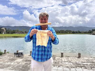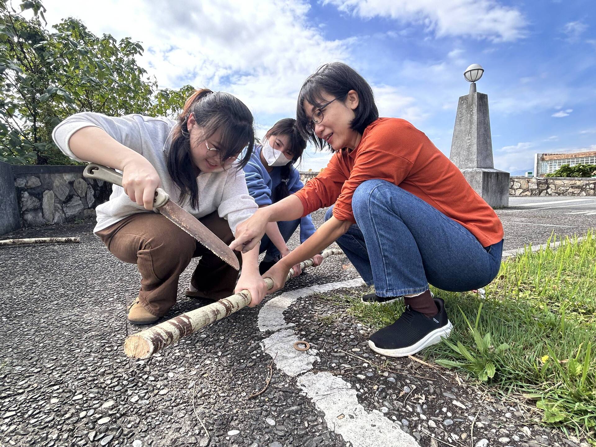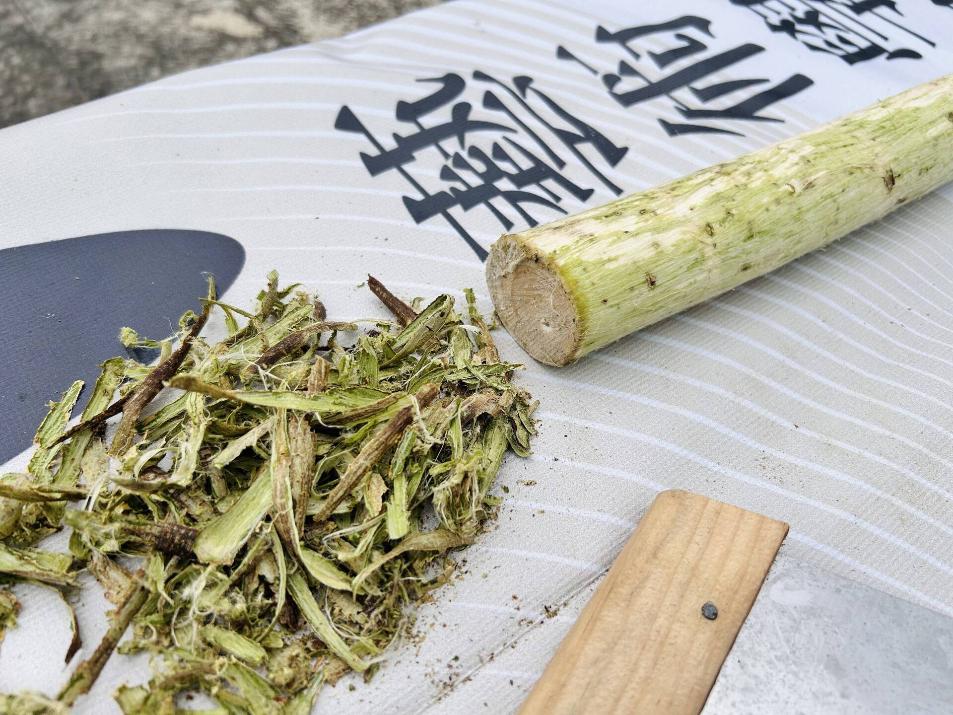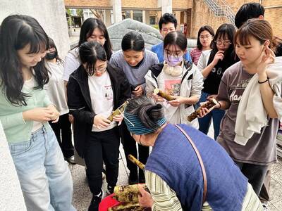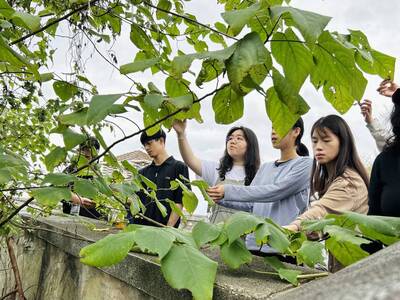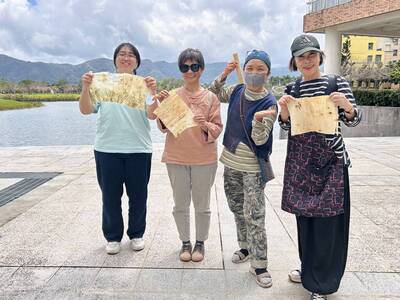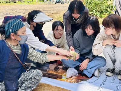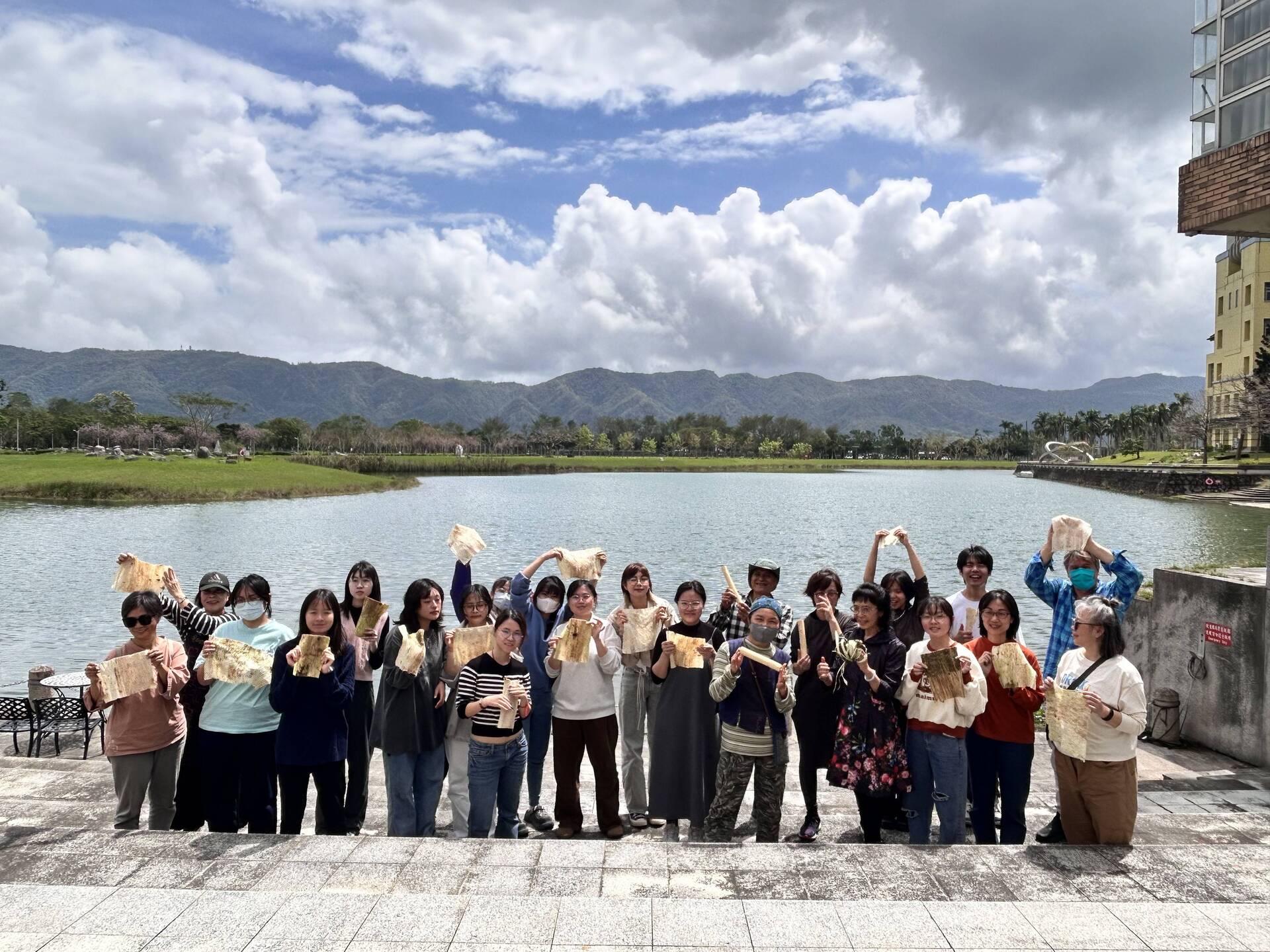 纖維藝術家淑燕老師長期投入樹皮布的創作研究與教學,她分享植物纖維與人的內在情感有著深刻的共鳴,能夠引導我們更直接地認識環境,也喚醒內在的感受力。從採集開始,老師帶領學員前往湖畔,親身認識構樹群,學習辨識與觀察。隨後,在刨除表皮、取下纖維、搥打洗滌的過程中,透過鎚起鎚落的節奏,構樹逐漸轉化為柔韌的樹皮布纖維。敲打的過程讓學員對構樹纖維的紋理留下深刻印象,也有學生分享,這種重複搥打的律動帶來內在的穩定與療癒感,讓人沉浸其中,感受到深層的共鳴與安定。